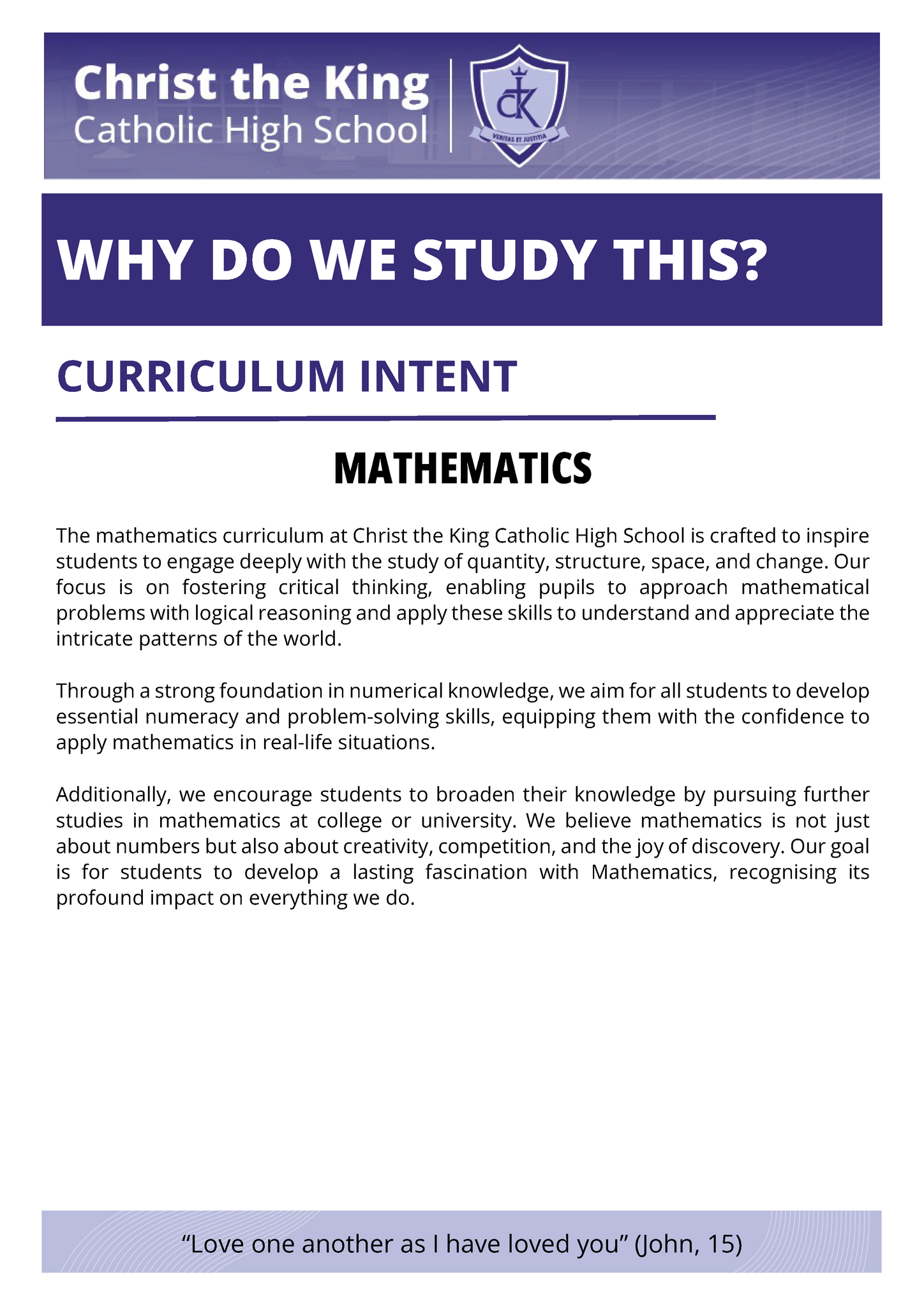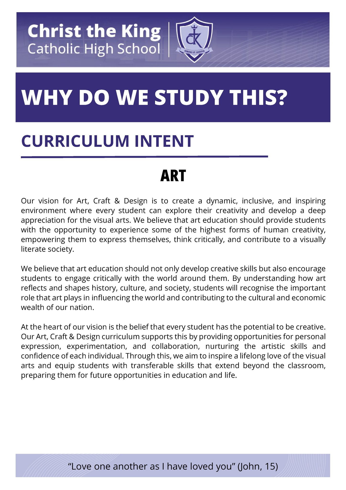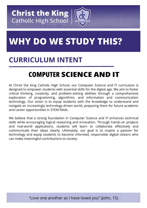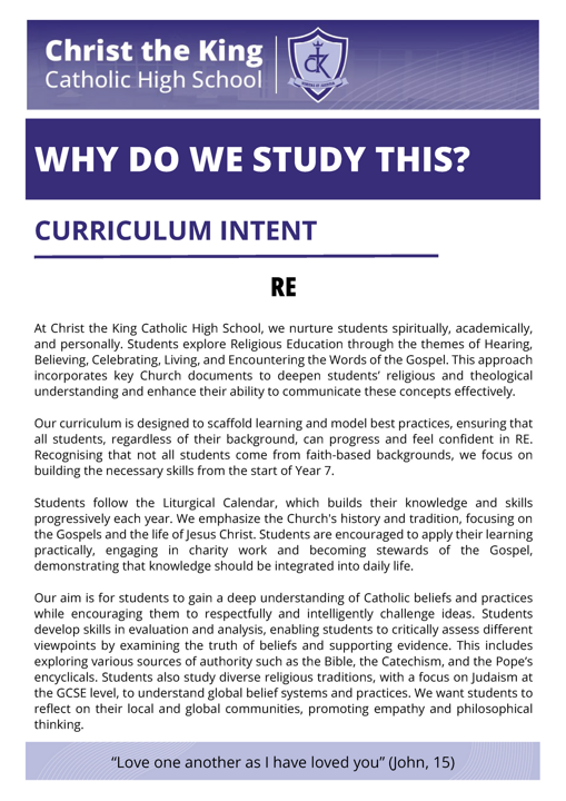 At Christ the King, our mission is to transform students' lives and educational prospects through a broad and ambitious curriculum that extends beyond the classroom. We are dedicated to teaching knowledge rigorously and emphasising skills that prepare students for higher education and the workforce. We strive to develop independent learners who think critically, solve problems creatively, and take ownership of their educational journey.