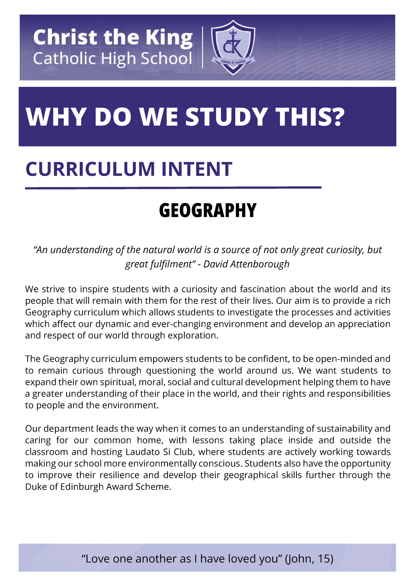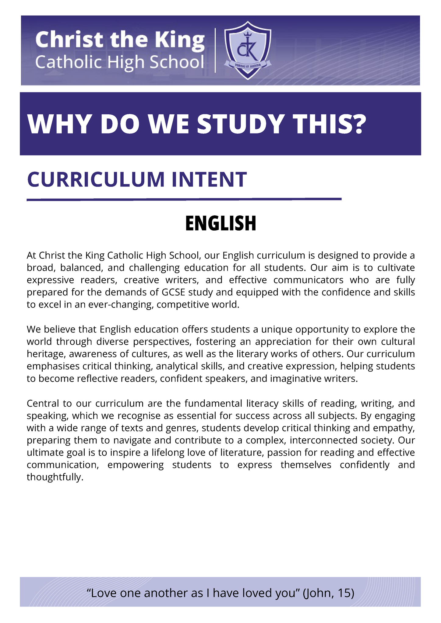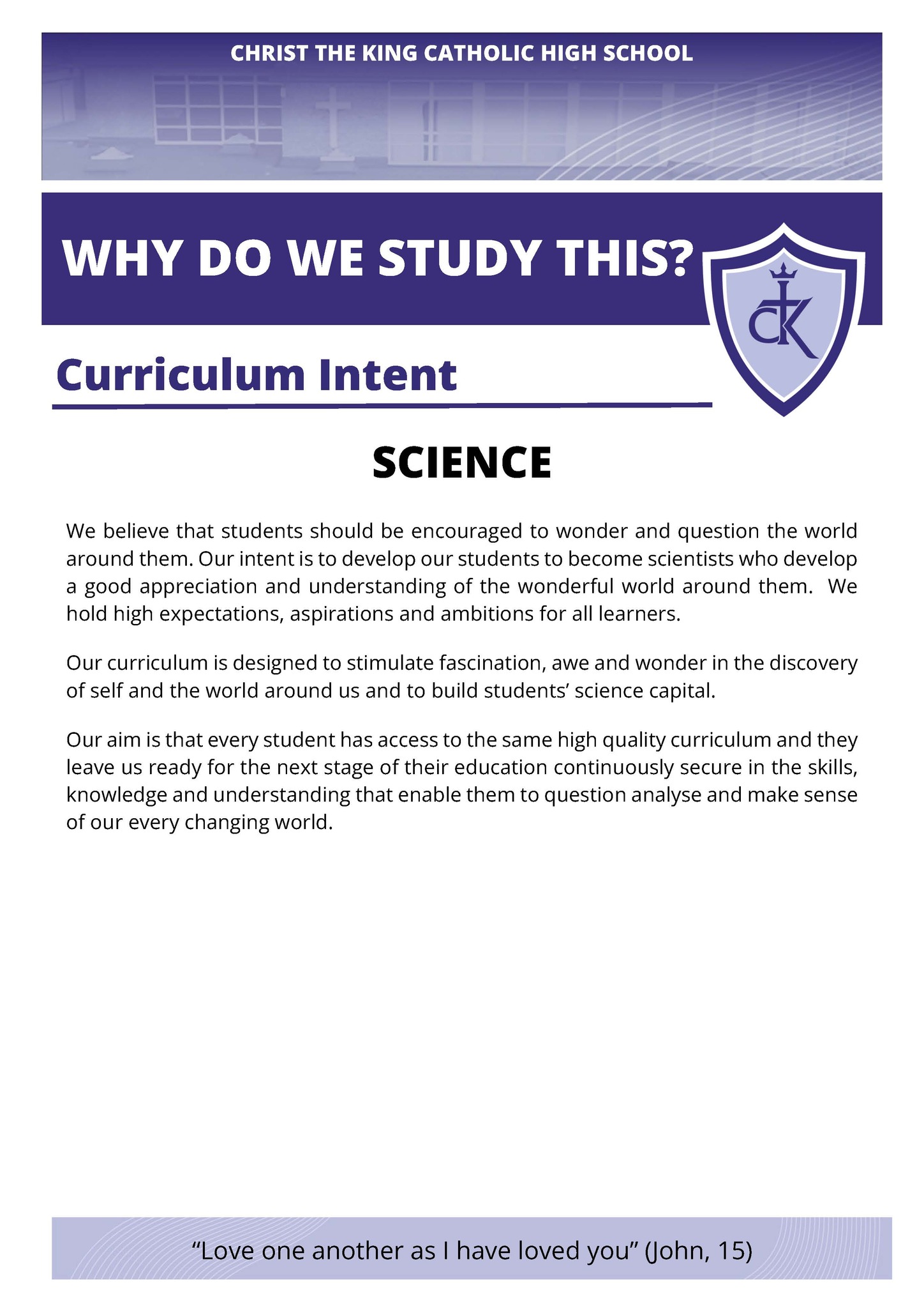 Guided by the words, "Love one another as I have loved you," and our Christian faith, our intent is to empower every student to achieve their fullest potential, reflect the love of Christ, and become lifelong learners and responsible citizens with a rich cultural capital.